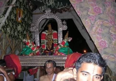 (c) ” KamalayA saha kluptha-YaathrOthsava SrI:” : The Lord’s Paadhukais (SadAchAryAs) and MahA Lakshmi are aj~nAtha nigraha Svaroopis (Those who are not known for their anger or punishment in contrast to their Lord, who can get quite angry over the trespasses of the rules of His SaasthrAs). They are eager to rush to protect the offending jeevans from their Lord’s anger as avasara pradheekshars. They travel with Their Lord to create an excuse (VyAjamAthra