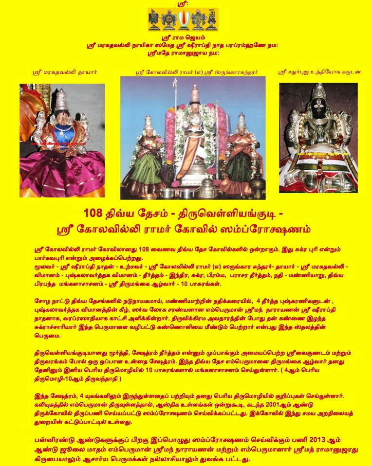 Earlier on December 13, 2013, Balalayam took place well at Thiruvelliyangudi Sri Kolavilliramar Temple. Significantly, during the homam, a Garuda Paravai (bird) was sitting on top of the Vimanam. This kainkaryam is taking place with the help of all the astikas as well as with the permission of the Tamil Nadu Hindu Religious Endowment Department. For related information and photographs, please visit Thiruvelliyangudi Sri Kolavilliramar Thirukkoil Balalayam