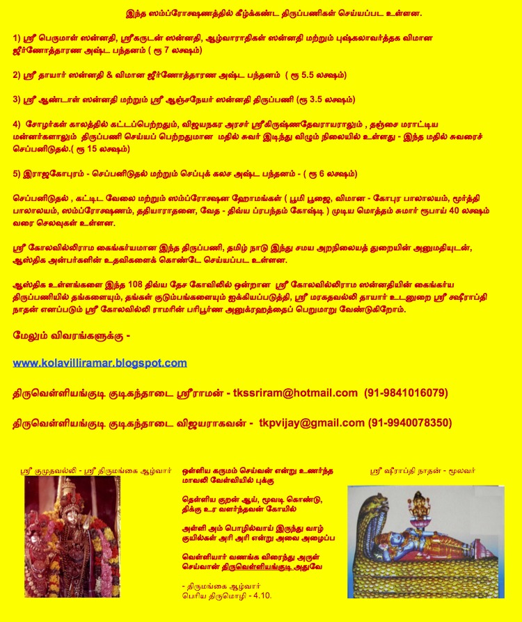 The Thiruppani committee is requesting like minded Asthikas who are interested in helping the kainkaryam to get in touch with below members or visit site - www.kolavilliramar.blogspot.